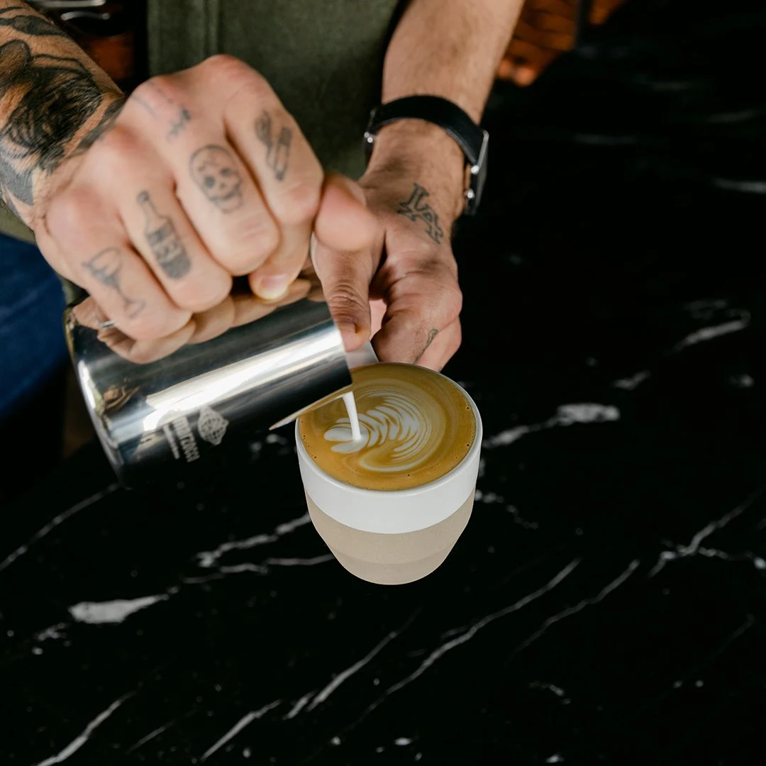 notNeutral’s Pico Small Latte Cup is perfect for serving traditional lattes consisting of espresso and steamed milk. This 8 oz cup features a two toned design with a glossy white glazed rim and textured body. The squared handle has enough clearance to fit your middle and index fingers for secure gripping. The glazed surface is ideal for sipping while the Pico’s tulip design helps to naturally retain heat. Made from Chinese terracotta, the cup features natural graduation in color with no two cups being exactly alike.