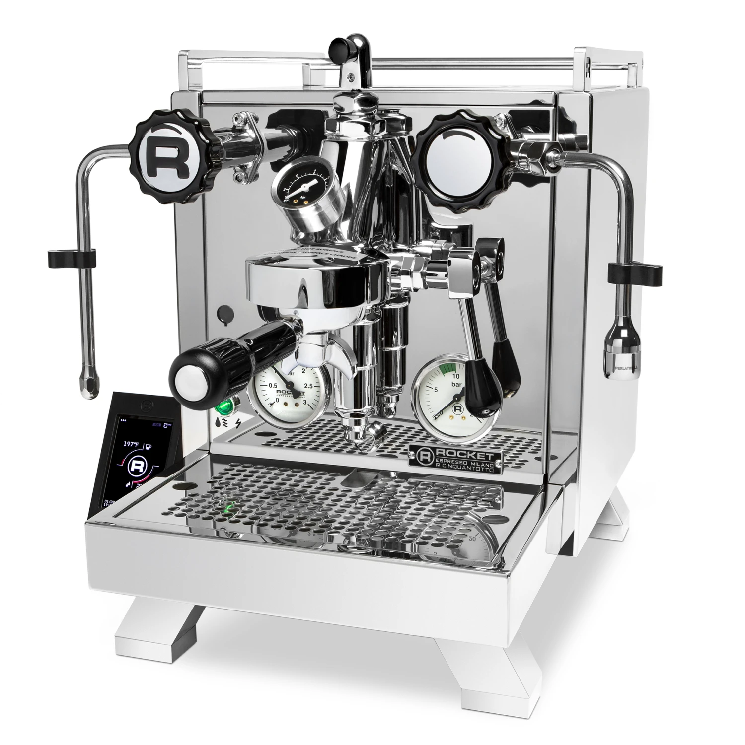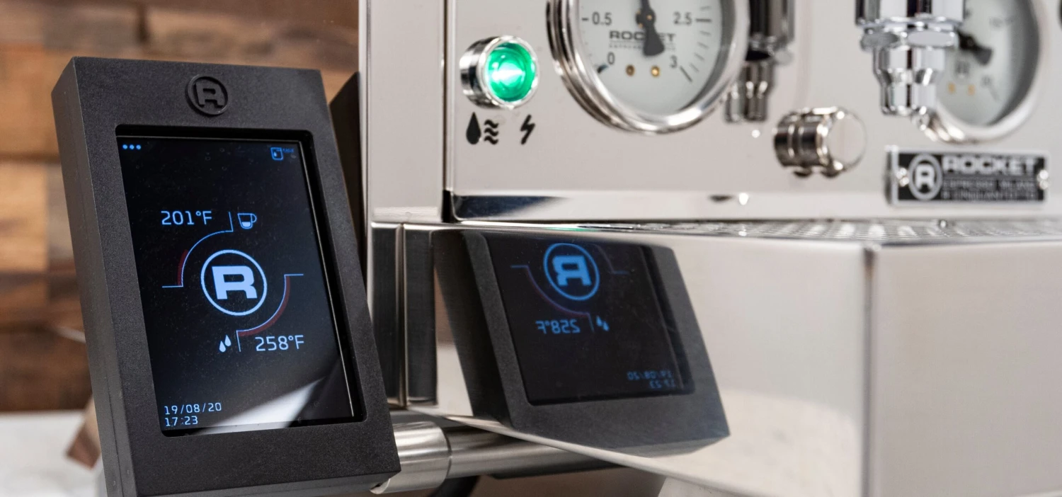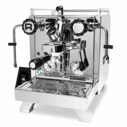 The Rocket R Cinquantotto with Flow Control, an update on the ever popular R58, is a dual boiler espresso machine, with a dual PID system controlled by a removable touchscreen display. Each boiler uses a dedicated PID to regulate the temperatures within each, and allow you to make adjustments to accommodate different roast profiles. Updated cup railings, legs, side panels, and the inclusion of shot timer are much appreciated updates to Rocket’s signature dual boiler machine.
